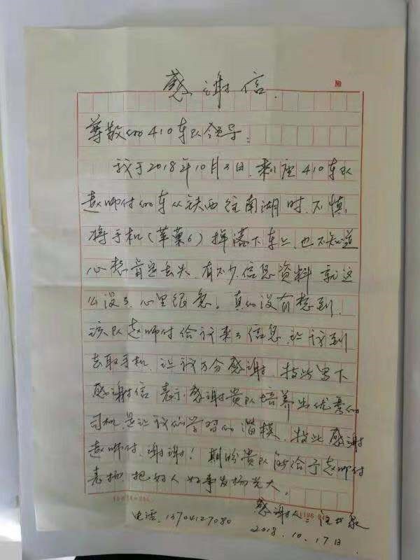 5.2018年10月16日,汪先生乘坐410線(xiàn)2061號(hào)駕駛員趙正博師傅車(chē)從鐵西往南湖走時(shí),不慎將手機(jī)掉到了車(chē)?yán),下?chē)后,汪先生很是著急,因?yàn)槭謾C(jī)內(nèi)有不少信息,正在焦急中,趙師傅拾到他的手機(jī)給他的家人去了信息,并把手機(jī)交到410線(xiàn)調(diào)度室,汪先生帶著表?yè)P(yáng)信來(lái)到調(diào)度室,調(diào)度及時(shí)把手機(jī)還給了失主,汪先生連連感謝,感謝貴公司培養(yǎng)出這樣優(yōu)秀的駕駛員。