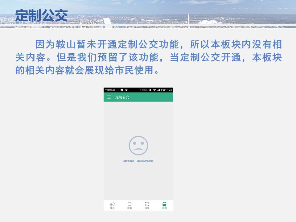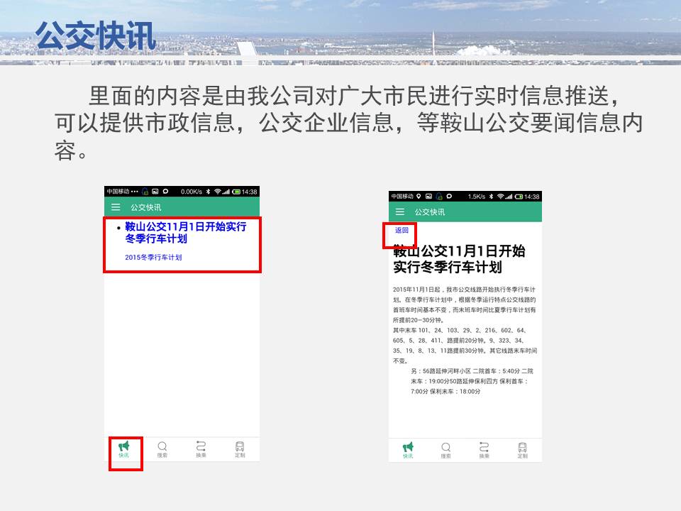 點點手機就可以看到公交車目前所在的位置,精準(zhǔn)地掐好出門時間,從而避免在惡劣天氣或高峰期苦苦候車,工作人員坐在調(diào)度室內(nèi)就能掌握車輛在路上的運行情況……為方便廣大市民出行,基于安卓平臺開發(fā)的“鞍山掌上公交”官方APP將于11月15日正式上線試運行,適用于蘋果IOS系統(tǒng)的APP將于明年初上線,市民可在公共交通總公司官網(wǎng)下載該軟件,并實現(xiàn)37條公交線路車輛實時查詢的便利服務(wù)。