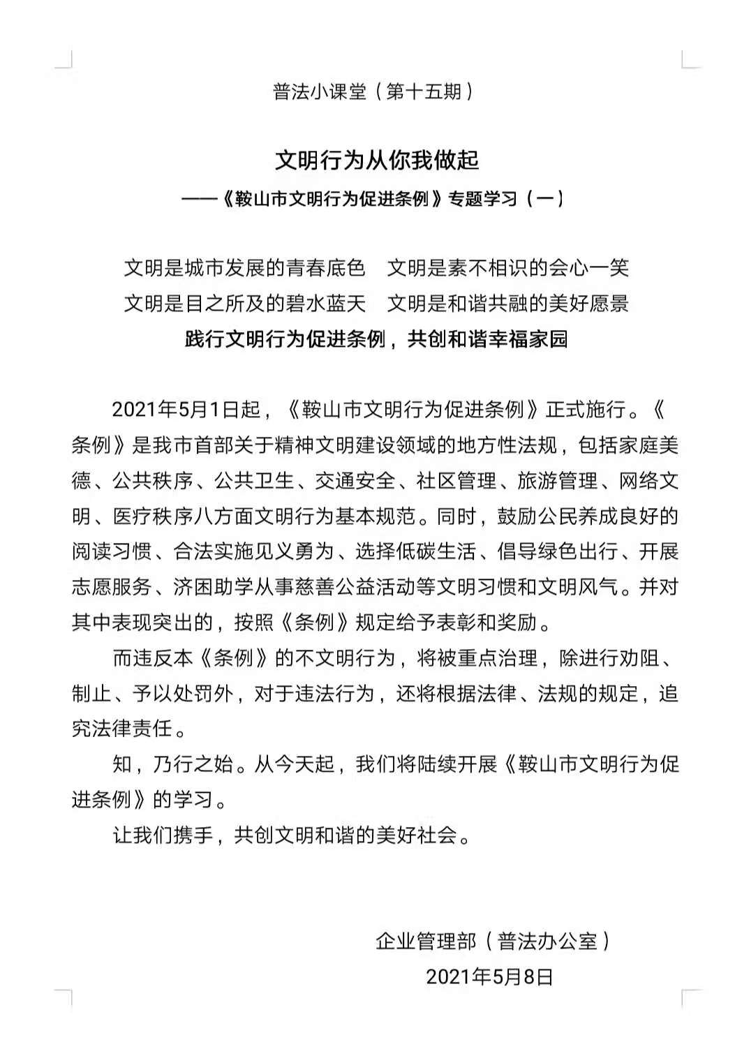 樹立文明風(fēng)尚,提升服務(wù)素質(zhì)交運(yùn)集團(tuán)全面推進(jìn)落實(shí)《鞍山市文明行為促進(jìn)條例》 《鞍山市文明行為促進(jìn)條例》是我市首部關(guān)于精神文明建設(shè)領(lǐng)域的地方性法規(guī),是我市精神文明建設(shè)的重要抓手,2021年5月1日起正式實(shí)施。為培育和踐行社會(huì)主義核心價(jià)值觀,引導(dǎo)和促進(jìn)文
